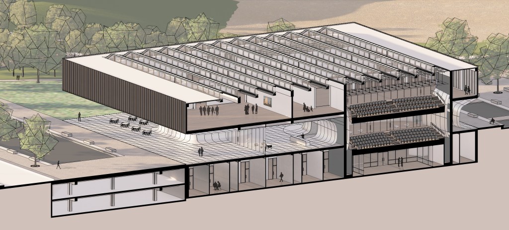 The form of the project, consequently, capitalized upon this intersection and sought to further the condition by effectively layering the programmatic requirements – a museum of sound, a school of music, and a newly instituted intersectional space, which would act as social lobby and circulatory space between the two main programmatic halves.