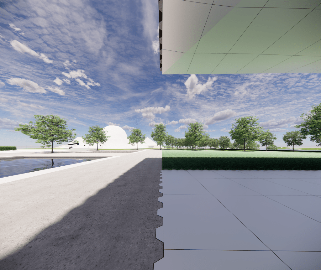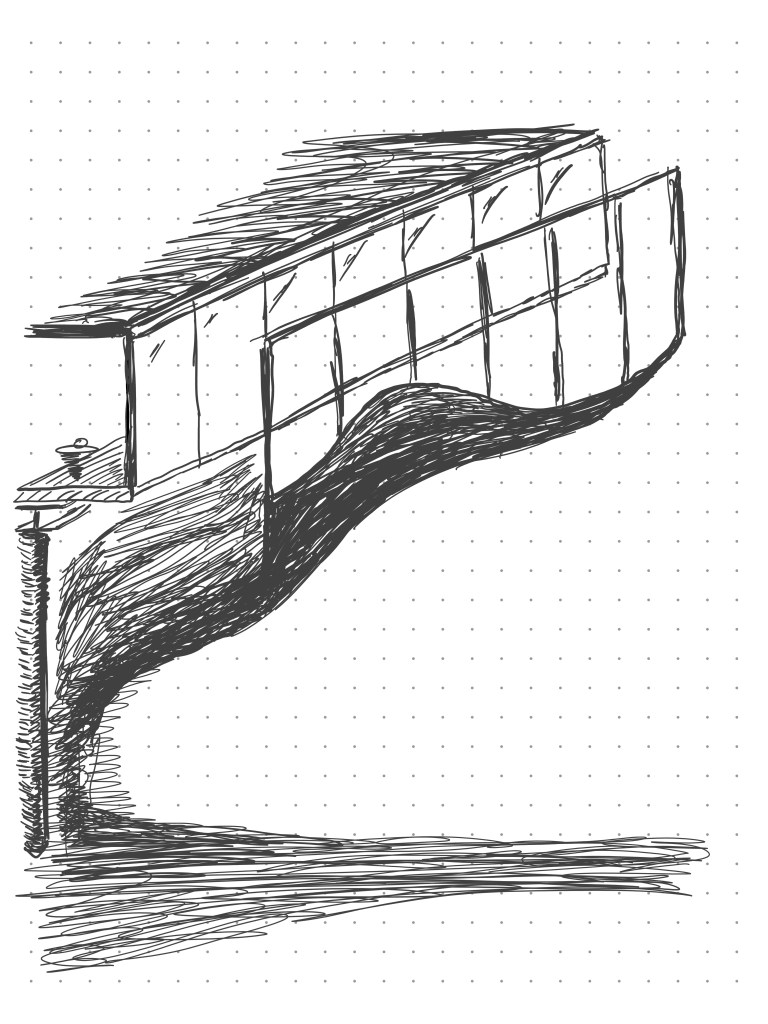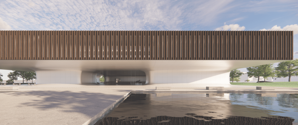 It seemed for a while that the facade (and thus the DNA of the primary volume) could – in theory – be made of any material, as long as it was not the same as the material below. Would it be solid or transparent? Reflective or matte? Perhaps it was made of bricks, artfully sculpted to reflect the waving nature of the lake?