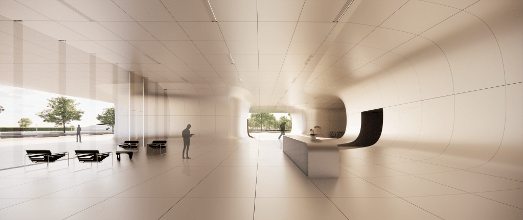 Smooth, planar, and edgeless, a precast panel system was selected to “enclose” the ground level. The image below shows, among other things, how doorways would simply be panels removed from the grid and specialized furnishings – such as the front desk – would be stretched castings filled with concrete.